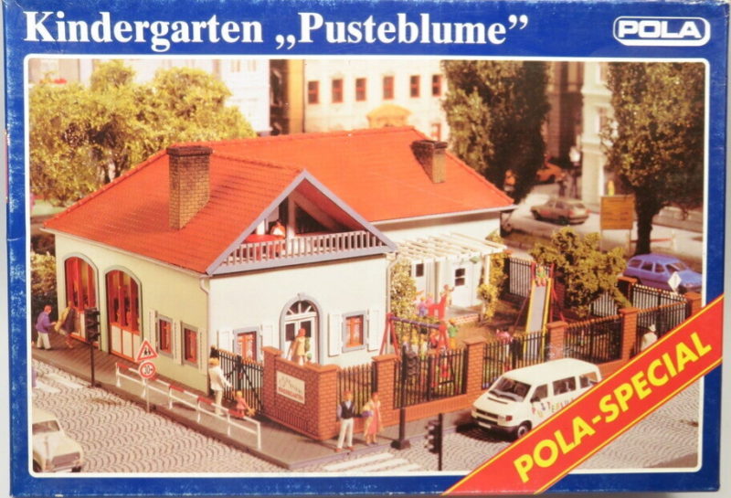 Het eerste model in de Pola_Special serie. Als de zon schijnt spelen kinderen het graag buiten. Dat is geen probleem bij Kinderopvang "Pusteblume" met glijbaan, schommel en zandbak in een eigen speeltuin. Een favoriete plek voor grote en kleine kinderen. Als het te warm wordt, zorgen twee bomen voor verkoelende schaduw.